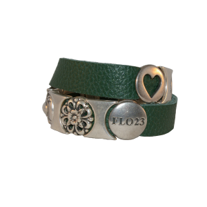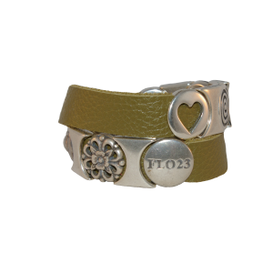 FLO23 armband met schuiven op een leren band van 15 mm breed die je om de pols wikkelt.