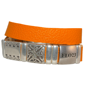 FLO23 armband met schuiven op een leren band van 15 mm breed die je om de pols wikkelt.